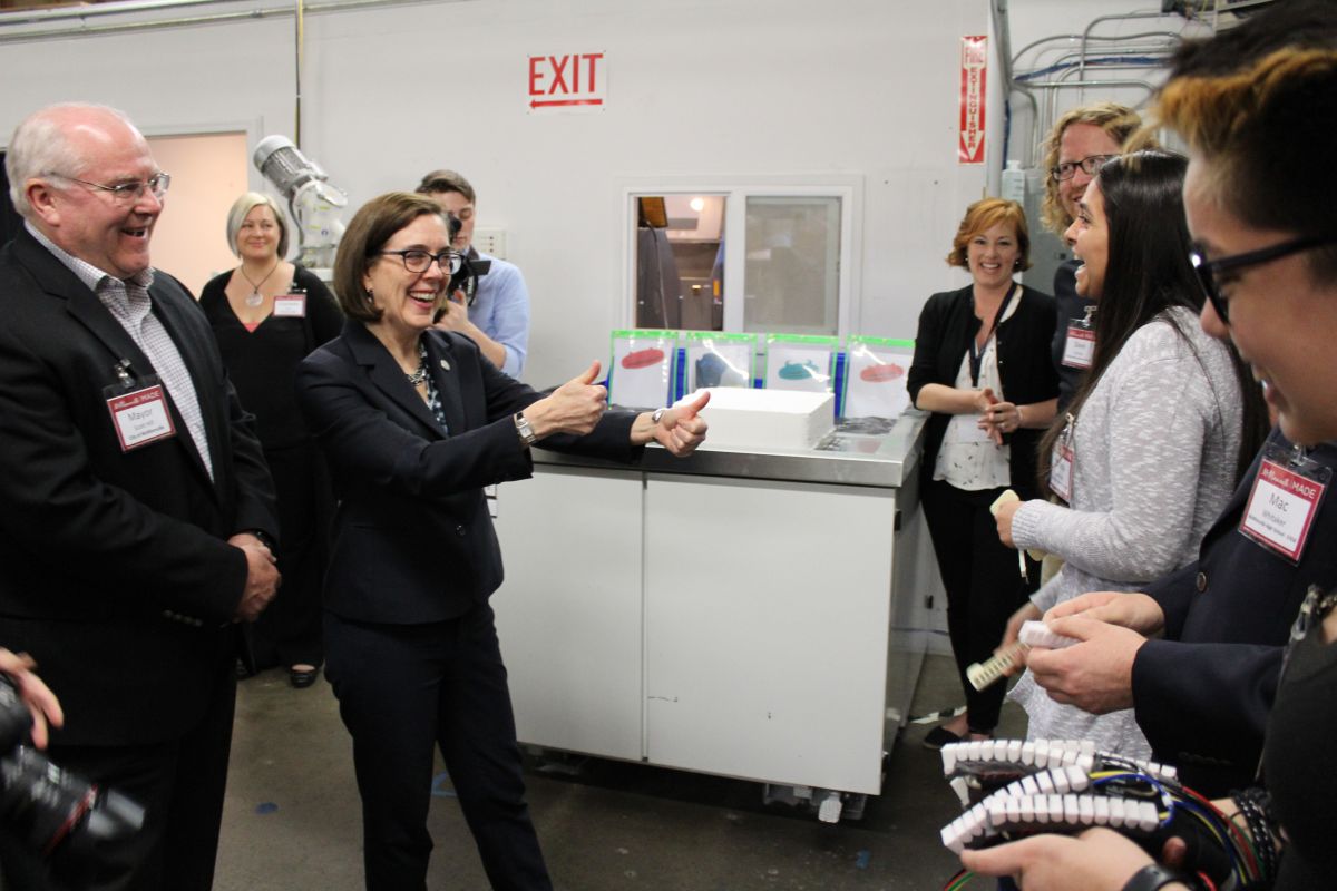 While speaking about workforce, Harris introduced the governor to three McMinnville High School EASA (Engineering & Aerospace Sciences Academy) students who had been invited to speak. Maria Martinez, Mac Whitaker, and Rebecca Long are all seniors in the EASA program and attended the tour with teacher Dave Larson. They spoke to Governor Brown about their most recent project, a Soft Hand Exoskeleton, as well as the impact the EASA program has had on their lives. From helping them discover what type of engineering inspires them the most, to how to work with different personality types, the students explained how the Career Pathways changed how they thought about their futures.