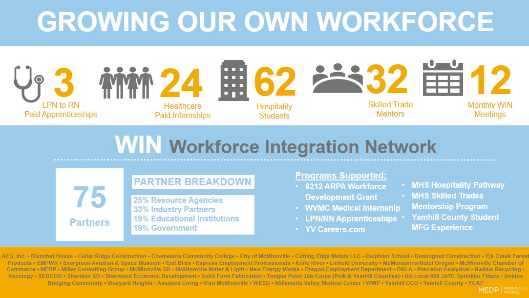 To get engaged and share your workforce perspective, connect with the WIN – Workforce Integration Network, meeting monthly at Chemeketa Community College Yamhill Valley Campus, McMinnville on the first Wednesday of the month from 3:00 – 4:00pm, Our next meeting is February 4, 2026. RSVP links can be found on the MEDP Event Calendar.
