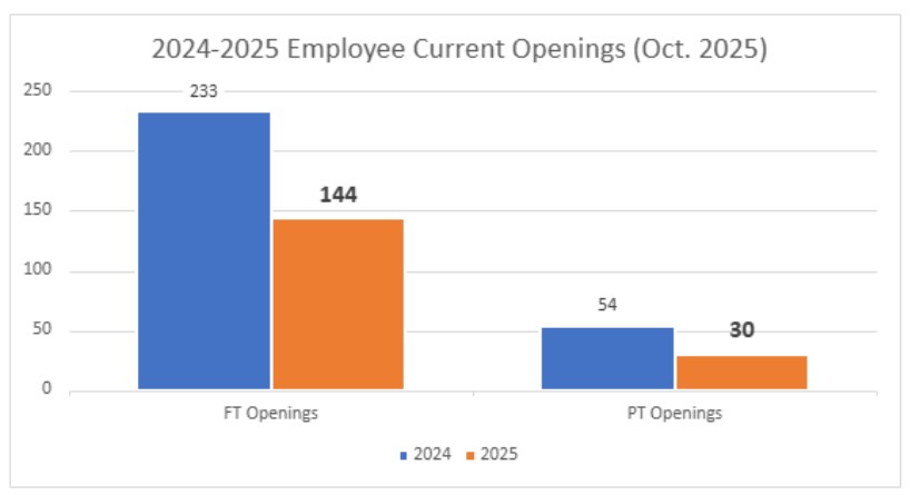 One of the clearer trends in the 2025 snapshot is a decline in reported open full-time positions compared with 2024. While this suggests some easing in immediate hiring pressure, employer feedback indicates that this change reflects a mix of factors — including adjusted hiring plans, redefined roles, retention strategies, and broader labor market cooling — rather than a simple resolution of workforce challenges.