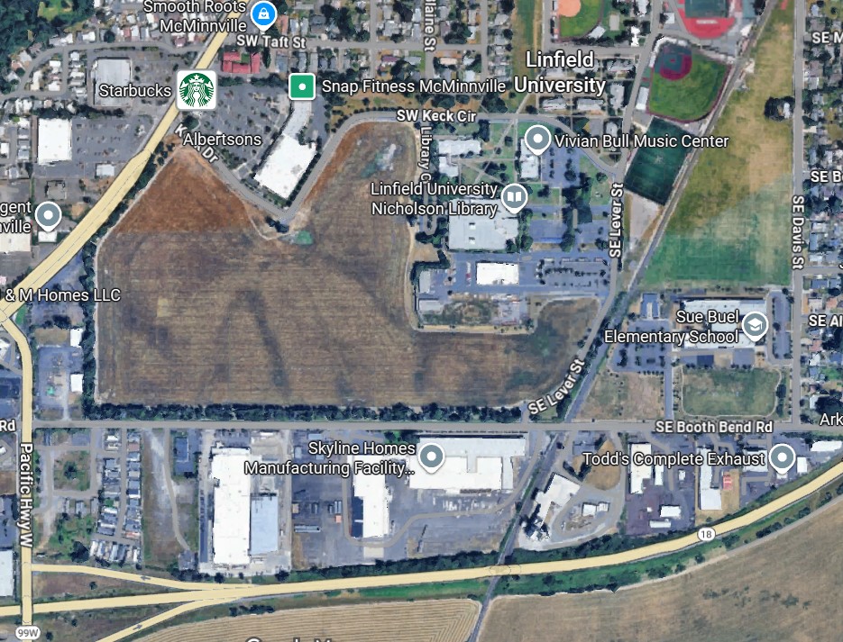 Linfield is considering development options for a 40-acre parcel south of Albertsons and Keck Drive and north of Southwest Booth Bend Road and a 33-acre triangle-shaped parcel north of Sue Buel Elementary School between Davis Street and the railroad tracks.